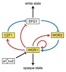 Next to the dimorphism and the first described high-frequency switching system C. albicans undergoes another high-frequency switching process called white to opaque switching, which is another phenotypic switching process in C. albicans. It was the second high-frequency switching system discovered in C. albicans.[41] The white to opaque switching is an epigenetic switching system.[65] Phenotypic switching is often used to refer to white-opaque switching, which consists of two phases: one that grows as round cells in smooth, white colonies (referred to as white form) and one that is rod-like and grows as flat, gray colonies (called opaque form). This switch from white cells to opaque cells is important for the virulence and the mating process of C. albicans as the opaque form is the mating competent form, being a million times more efficient in mating compared to the white type.[65][66][67] This switching between white and opaque form is regulated by the WOR1 regulator (White to Opaque Regulator 1) which is controlled by the mating type locus (MTL) repressor (a1-α2) that inhibits the expression of WOR1.[68] Besides the white and opaque phase there is also a third one: the gray phenotype. This phenotype shows the highest ability to cause cutaneous infections. The white, opaque and gray phenotypes form a tristable phenotypic switching system. Since it is often difficult to differentiate between white, opaque and gray cells phloxine B, a dye, can be added to the medium.[61]