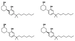 Cannabicyclohexanol has four enantiomers, which by analogy with other related cannabinoid compounds can be expected to have widely varying affinity for cannabinoid receptors, and consequently will show considerable variation in potency.[7] While the (-)-cis enantiomer (-)-cannabicyclohexanol discovered in the original Pfizer research is expected to be the most potent, all four enantiomers have been isolated from illicit samples of this compound, and the properties of the other three enantiomers have not been studied in detail. Most commonly cannabicyclohexanol is encountered as a diastereomeric mix of the two cis or two trans isomers in varying ratios, though more rarely a mixture of all four enantiomers has been seen, as well as reasonably enantiopure samples of the most active isomer.[8][9][10] Confusion can arise around the naming of these compounds as they can be viewed either as substituted phenols or substituted cyclohexanols, but this results in different numbering of the rings. Consequently, the active isomer can be named either 2-[(1S,3R)-3-hydroxycyclohexyl]-5-(2-methylnonan-2-yl)phenol or (1R,3S)-3-[2-hydroxy-4-(2-methylnonan-2-yl)phenyl]cyclohexan-1-ol.
