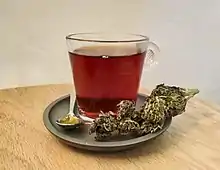 Cannabis tea (also known as weed tea, pot tea, ganja tea or a cannabis decoction) is a cannabis-infused drink prepared by steeping various parts of the cannabis plant in hot or cold water. Cannabis tea is commonly recognized as an alternative form of preparation and consumption of the cannabis plant, more popularly known as marijuana, pot, or weed. This plant has long been recognized as an herbal medicine[1] employed by health professionals worldwide to ease symptoms of disease,[2] as well as a psychoactive drug used recreationally[3] and in spiritual traditions. Though less commonly practiced than popular methods like smoking or consuming edibles, drinking cannabis tea can produce comparable physical and mental therapeutic effects. Such effects are largely attributed to the THC content of the tea, levels of which are drastically dependent on individual preparation techniques involving volume, amount of cannabis, and boiling time.[4] Also in common with these administration forms of cannabis is the heating component performed before usage. Due to the rather uncommon nature of this particular practice of cannabis consumption in modern times (in contrast to historical use), the research available on the composition of cannabis tea is limited and based broadly around what is known of cannabis as it exists botanically.