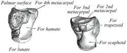The medial surface articulates with the hamate bone by a smooth, concave, oblong facet, which occupies its posterior and superior parts; it is rough in front, for the attachment of an interosseous ligament.[1]