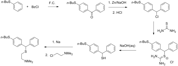Friedel-Crafts acylation of the n-butyl ether of thiophenol with benzoyl chloride gives the corresponding benzophenone. Reduction of the ketone with zinc/NaOH followed by treatment with HCl in ether affords the benzhydryl chloride. Displacement of the halogen with thiourea gives, by reaction of the last at its most nucleophilic center, the isothiouronium salt. Hydrolysis of the salt leads to the sulfur analog of a benzhydrol. Alkylation of the sodium salt of this last with N-(2-chloroethyl)dimethylamine affords captodiame.