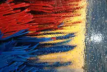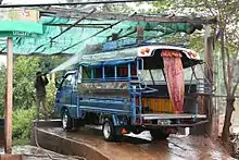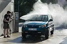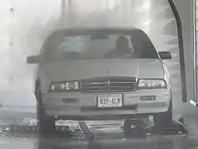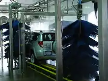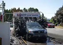 Like soft-touch car washes, touchless car washes are automated, with the vehicle passing through a tunnel where the vehicle is cleaned; however, touchless car washes do not use the foam or cloth applicators that soft-touch washes use, instead of relying on high-pressure washers to both clean and rinse the vehicle off. Sensors utilized by these washes allow for a more precise clean along with the vehicle's exact shape.[9] To compensate for not physically contacting the vehicle, touchless washes use more caustic detergents than ordinary car washes.[10] Because the vehicle is not physically impacted during a touchless wash, the vehicle is at a lower risk of being damaged. However, touchless washes have a harder time cleaning off tougher materials or reaching difficult-to-reach locations on vehicles, and their usage of stronger chemicals can potentially damage a vehicle's paint finish.[9][11]