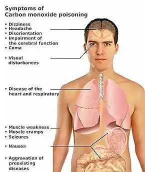 The main manifestations of carbon monoxide poisoning develop in the organ systems most dependent on oxygen use, the central nervous system and the heart.[16] The initial symptoms of acute carbon monoxide poisoning include headache, nausea, malaise, and fatigue.[25] These symptoms are often mistaken for a virus such as influenza or other illnesses such as food poisoning or gastroenteritis.[26] Headache is the most common symptom of acute carbon monoxide poisoning; it is often described as dull, frontal, and continuous.[27] Increasing exposure produces cardiac abnormalities including fast heart rate, low blood pressure, and cardiac arrhythmia;[28][29] central nervous system symptoms include delirium, hallucinations, dizziness, unsteady gait, confusion, seizures, central nervous system depression, unconsciousness, respiratory arrest, and death.[30][31] Less common symptoms of acute carbon monoxide poisoning include myocardial ischemia, atrial fibrillation, pneumonia, pulmonary edema, high blood sugar, lactic acidosis, muscle necrosis, acute kidney failure, skin lesions, and visual and auditory problems.[28][32][33][34]