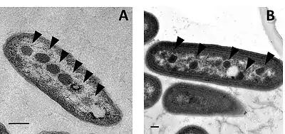 Polyhedral bodies were discovered by transmission electron microscopy in the cyanobacterium Phormidium uncinatum in 1956.[8] These were later observed in other cyanobacteria[9] and in some chemotrophic bacteria that fixed carbon dioxide—many of them are sulfur reducers or nitrogen fixers (for example, Halothiobacillus, Acidithiobacillus, Nitrobacter and Nitrococcus; all belonging to Proteobacteria).[2][10] The polyhedral bodies were first purified from Thiobacillus neapolitanus (now Halothiobacillus neapolitanus) in 1973 and shown to contain RuBisCO, held within a rigid outer covering.[11] The authors proposed that since these appeared to be organelles involved in carbon fixation, they should be called carboxysomes.[11]