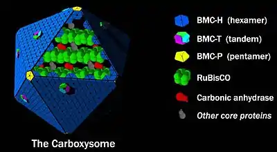 Carboxysomes are bacterial microcompartments (BMCs) consisting of polyhedral protein shells filled with the enzymes ribulose-1,5-bisphosphate carboxylase/oxygenase (RuBisCO)—the predominant enzyme in carbon fixation and the rate limiting enzyme in the Calvin cycle—and carbonic anhydrase.[2]