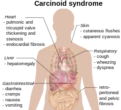 Carcinoid syndrome is a paraneoplastic syndrome comprising the signs and symptoms that occur secondary to carcinoid tumors. The syndrome includes flushing and diarrhea, and less frequently, heart failure, vomiting and bronchoconstriction.[3] It is caused by endogenous secretion of mainly serotonin and kallikrein.