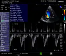 Echocardiography is a non-invasive method of quantifying cardiac output using ultrasound. Two-dimensional (2D) ultrasound and Doppler measurements are used together to calculate cardiac output. 2D measurement of the diameter (d) of the aortic annulus allows calculation of the flow cross-sectional area (CSA), which is then multiplied by the VTI of the Doppler flow profile across the aortic valve to determine the flow volume per beat (stroke volume, SV). The result is then multiplied by the heart rate (HR) to obtain cardiac output. Although used in clinical medicine, it has a wide test-retest variability.[8] It is said to require extensive training and skill, but the exact steps needed to achieve clinically adequate precision have never been disclosed. 2D measurement of the aortic valve diameter is one source of noise; others are beat-to-beat variation in stroke volume and subtle differences in probe position. An alternative that is not necessarily more reproducible is the measurement of the pulmonary valve to calculate right-sided CO. Although it is in wide general use, the technique is time consuming and is limited by the reproducibility of its component elements. In the manner used in clinical practice, precision of SV and CO is of the order of ±20%.