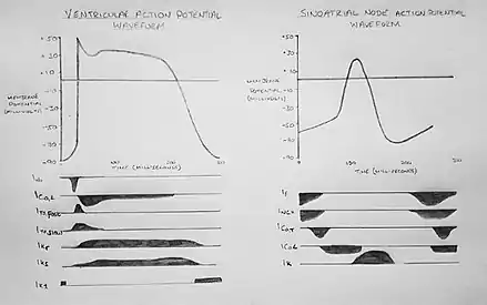 The cardiac action potential is a brief change in voltage (membrane potential) across the cell membrane of heart cells.[1] This is caused by the movement of charged atoms (called ions) between the inside and outside of the cell, through proteins called ion channels. The cardiac action potential differs from action potentials found in other types of electrically excitable cells, such as nerves. Action potentials also vary within the heart; this is due to the presence of different ion channels in different cells (see below).