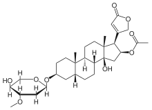 The general structure of a cardiac glycoside consists of a steroid molecule attached to a sugar (glycoside) and an R group.[4] The steroid nucleus consists of four fused rings to which other functional groups such as methyl, hydroxyl, and aldehyde groups can be attached to influence the overall molecule's biological activity.[4] Cardiac glycosides also vary in the groups attached at either end of the steroid. Specifically, different sugar groups attached at the sugar end of the steroid can alter the molecule's solubility and kinetics; however, the lactone moiety at the R group end only serves a structural function.[5]