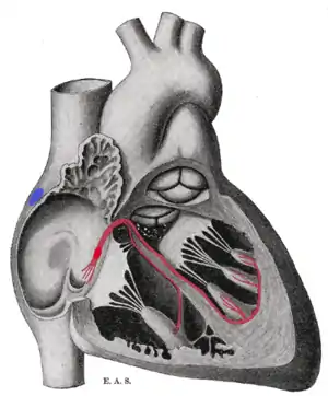Schematic representation of the sinoatrial node and the atrioventricular bundle of His. The location of the SA node is shown in blue. The bundle, represented in red, originates near the orifice of the coronary sinus, undergoes slight enlargement to form the AV node. The AV node tapers down into the bundle of HIS, which passes into the ventricular septum and divides into two bundle branches, the left and right bundles. The ultimate distribution cannot be completely shown in this diagram.