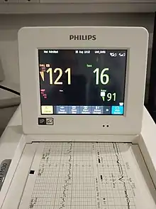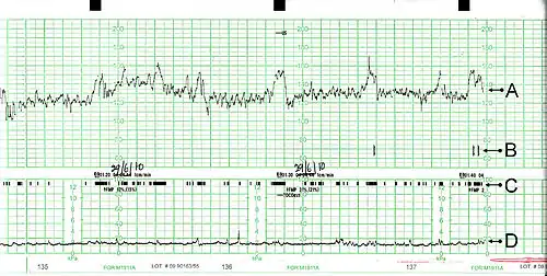 ![]() A cardiotocograph recording fetal heart rate and uterine contractions | |