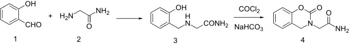 Synthesis starts by reductive amination of salicylaldehyde and glycinamide to give 3. The synthesis is completed by reaction with phosgene and NaHCO3.