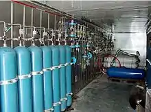 A cascade filling system is a high pressure gas cylinder storage system which is used for the refilling of smaller compressed gas cylinders.[1][2] In some applications, each of the large cylinders is filled by a compressor, otherwise they may be filled remotely and replaced when the pressure is too low for effective transfer. The cascade system allows small cylinders to be filled without a compressor. In addition, a cascade system is useful as a reservoir to allow a low-capacity compressor to meet the demand of filling several small cylinders in close succession, with longer intermediate periods during which the storage cylinders can be recharged.