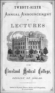 On November 1, 1843, under President George Edmond Pierce, five faculty members including Jared Potter Kirtland and John Delamater, and sixty-seven students began the first medical lectures at the Medical Department of Western Reserve College (also known as the Cleveland Medical College) in Hudson, Ohio.[5][6] Kirtland and Delamater had previously been instructors at a medical college started in 1834, the Medical Department of Willoughby University of Lake Erie, which had closed in 1843 due to faculty disagreements.[5] Other faculty from that Medical Department went on to found Willoughby Medical College of Columbus, a precursor to the Ohio State University College of Medicine.[7]
