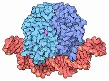 Catabolite activator protein (CAP; also known as cAMP receptor protein, CRP) is a trans-acting transcriptional activator that exists as a homodimer in solution. Each subunit of CAP is composed of a ligand-binding domain at the N-terminus (CAPN, residues 1-138) and a DNA-binding domain at the C-terminus (DBD, residues 139-209).[1][2] Two cAMP (cyclic AMP) molecules bind dimeric CAP with negative cooperativity. Cyclic AMP functions as an allosteric effector by increasing CAP's affinity for DNA. CAP binds a DNA region upstream from the DNA binding site of RNA Polymerase. CAP activates transcription through protein-protein interactions with the α-subunit of RNA Polymerase. This protein-protein interaction is responsible for (i) catalyzing the formation of the RNAP-promoter closed complex; and (ii) isomerization of the RNAP-promoter complex to the open confirmation. CAP's interaction with RNA polymerase causes bending of the DNA near the transcription start site, thus effectively catalyzing the transcription initiation process.[3] CAP's name is derived from its ability to affect transcription of genes involved in many catabolic pathways. For example, when the amount of glucose transported into the cell is low, a cascade of events results in the increase of cytosolic cAMP levels. This increase in cAMP levels is sensed by CAP, which goes on to activate the transcription of many other catabolic genes.