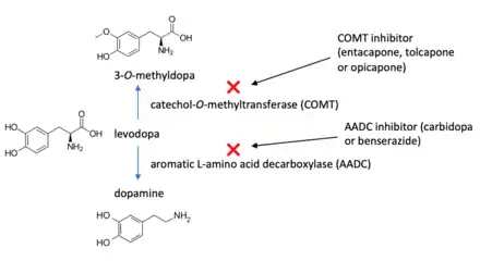 A catechol-O-methyltransferase (COMT) inhibitor is a drug that inhibits the enzyme catechol-O-methyltransferase. This enzyme methylates catecholamines such as dopamine, norepinephrine and epinephrine. It also methylates levodopa. COMT inhibitors are indicated for the treatment of Parkinson's disease in combination with levodopa and an aromatic L-amino acid decarboxylase inhibitor (e.g. carbidopa or benserazide). The therapeutic benefit of using a COMT inhibitor is based on its ability to prevent the methylation of levodopa to 3-O-methyldopa, thus increasing the bioavailability of levodopa. COMT inhibitors significantly decrease off time in people with Parkinson's disease also taking carbidopa/levodopa.[1]
