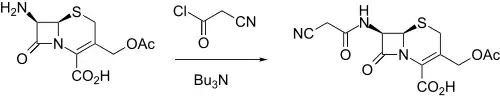 It was made by reacting 7-ACA (7-aminocephalosporanic acid) with cyanoacetyl chloride in the presence of tributylamine.