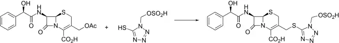 Cefonicid is synthesized conveniently by nucleophilic displacement of the 3-acetoxy moiety of 1 with the appropriately substituted tetrazole thiole 2. The mandelic acid amide C-7 side chain is reminiscent of cefamandole.