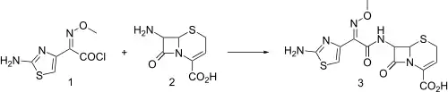 Injectable third generation cephalosporin antibiotic related to cefotaxime, q.v. Exhibits broad spectrum activity and resistance to β-lactamase hydrolysis.