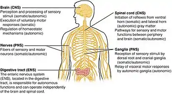 ![]() Schematic diagram showing the central nervous system in yellow, peripheral in orange | |