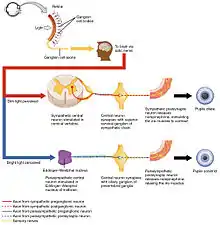 The brainstem at large provides entry and exit to the brain for a number of pathways for motor and autonomic control of the face and neck through cranial nerves,[9] Autonomic control of the organs is mediated by the tenth cranial nerve.[6] A large portion of the brainstem is involved in such autonomic control of the body. Such functions may engage the heart, blood vessels, and pupils, among others.[9]