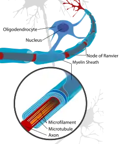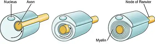 The way in which the Schwann cells and oligodendrocytes myelinate nerves differ. A Schwann cell usually myelinates a single axon, completely surrounding it. Sometimes, they may myelinate many axons, especially when in areas of short axons.[8] Oligodendrocytes usually myelinate several axons. They do this by sending out thin projections of their cell membrane, which envelop and enclose the axon.
