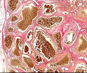 Cerebral Cavernous Malformation (CCM) is a cavernous hemangioma that arises in the central nervous system (CNS). It can be considered to be a variant of hemangioma, and is characterized by grossly large dilated blood vessels and large vascular channels, less well circumscribed, and more involved with deep structures, with a single layer of endothelium and an absence of neuronal tissue within the lesions. These thinly walled vessels resemble sinusoidal cavities filled with stagnant blood. Blood vessels in patients with cerebral cavernous malformations (CCM) can range from a few millimeters to several centimeters in diameter. Most lesions occur in the brain, but any organ may be involved.[1]
