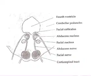 ![]() Axial section of the Brainstem (Pons) at the level of the Facial Colliculus (Central tegmental tract not labeled, but region is visible.) | |