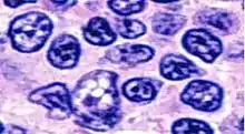 A centrocyte generally refers to a B cell with a cleaved nucleus,[2] as may appear in e.g. follicular lymphoma.[3] Centrocytes are B cells that are found in the light zones of germinal centers. Centrocytes are the non-dividing progeny of Centroblasts, and although they are relatively similar in size, centrocytes lack distinct nucleoli and are more irregularly shaped than centroblasts[4] Centrocytes also express the cell-surface hypermutated B-cell receptor following AID activation. This hypermutated B-cell receptor allows centrocytes to compete for binding of the antigen, internalize it, and then express the processed peptides through their MHC class II receptor.[5] Centrocyte can also refer to a cell with a protoplasm that contains single and double granules of varying size stainable with hematoxylin, as seen in lesions of lichen planus,[2] or a nondividing, activated B cell that expresses membrane immunoglobulin.[2]