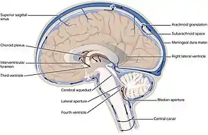 There is about 125–150 mL of CSF at any one time.[1] This CSF circulates within the ventricular system of the brain. The ventricles are a series of cavities filled with CSF. The majority of CSF is produced from within the two lateral ventricles. From here, CSF passes through the interventricular foramina to the third ventricle, then the cerebral aqueduct to the fourth ventricle. From the fourth ventricle, the fluid passes into the subarachnoid space through four openings – the central canal of the spinal cord, the median aperture, and the two lateral apertures.[1] CSF is present within the subarachnoid space, which covers the brain, spinal cord, and stretches below the end of the spinal cord to the sacrum.[1][2] There is a connection from the subarachnoid space to the bony labyrinth of the inner ear making the cerebrospinal fluid continuous with the perilymph in 93% of people.[3]
