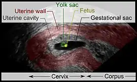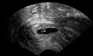 | Vaginal ultrasonography of a cervical pregnancy at a gestational age of 5 weeks. See image below for details of the visible structures.[1] | |