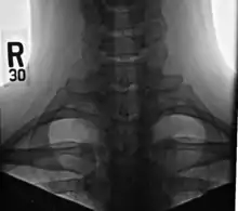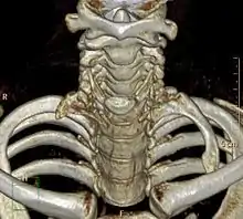A cervical rib in humans is an extra rib which arises from the seventh cervical vertebra. Their presence is a congenital abnormality located above the normal first rib. A cervical rib is estimated to occur in 0.2% (1 in 500 people)[2] to 0.5%[3] of the population.[4] People may have a cervical rib on the right, left or both sides.[5]
