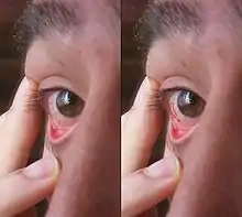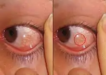 Chemosis is the swelling (or edema) of the conjunctiva. The term derives from the Greek chem- meaning chemical[1] and -osis meaning denoting action.[2] A chemical reaction, or in this case, a chemical reaction of the conjunctiva which is due to the oozing of exudate from abnormally permeable capillaries. In general, chemosis is a nonspecific sign of eye irritation. The outer surface covering appears to have fluid in it. The conjunctiva becomes swollen and gelatinous in appearance. Often, the eye area swells so much that the eyes become difficult or impossible to close fully.[3] Sometimes, it may also appear as if the eyeball has moved slightly backwards from the white part of the eye due to the fluid filled in the conjunctiva all over the eyes except the iris. The iris is not covered by this fluid and so it appears to be moved slightly inwards.