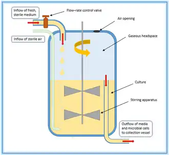 A chemostat (from chemical environment is static) is a bioreactor to which fresh medium is continuously added, while culture liquid containing left over nutrients, metabolic end products and microorganisms are continuously removed at the same rate to keep the culture volume constant.[2][3] By changing the rate with which medium is added to the bioreactor the specific growth rate of the microorganism can be easily controlled within limits.