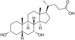 Chenodeoxycholic acid (CDCA; also known as chenodesoxycholic acid, chenocholic acid and 3α,7α-dihydroxy-5β-cholan-24-oic acid) is a bile acid. Salts of this carboxylic acid are called chenodeoxycholates. Chenodeoxycholic acid is one of the main bile acids.[1][2][3] It was first isolated from the bile of the domestic goose, which gives it the "cheno" portion of its name (Greek: χήν = goose).[4]