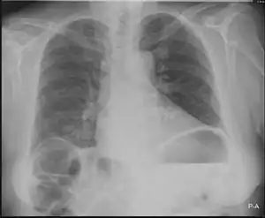 | Chest X-ray showing obvious Chilaiditi's sign, or presence of gas in the right colic angle between the liver and right hemidiaphragm. | |