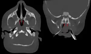 Choanal atresia can be suspected if it is impossible to insert a nasal catheter.[5] Also, if one notices a continuous stream of mucus draining from one or both nostrils, it could be a sign of an atresia. Another common sign is cyanosis in an infant while breast feeding, as breathing is dependent on nasal patency in this situation.[5] Diagnosis is confirmed by radiological imaging, usually CT scan.[5] In 1950, in Franklin County, NY, a nurse noticed that a day-old infant turned blue when bottle-fed. “There is something wrong with the baby. We are sending her to Montreal!” The baby was hospitalized over a year. The ENT Surgeon had to gerry-rig a dental drill to accomplish the repair. In 2020, neonatal care for bilateral choanal atresia is much improved.