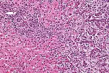 Micrograph of an intrahepatic cholangiocarcinoma (right of image) adjacent to normal liver cells (left of image). H&E stain.