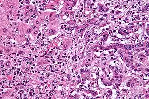 Risk factors for cholangiocarcinoma include primary sclerosing cholangitis (an inflammatory disease of the bile ducts), ulcerative colitis, cirrhosis, hepatitis C, hepatitis B, infection with certain liver flukes, and some congenital liver malformations.[1][3][8] However, most people have no identifiable risk factors.[3] The diagnosis is suspected based on a combination of blood tests, medical imaging, endoscopy, and sometimes surgical exploration.[4] The disease is confirmed by examination of cells from the tumor under a microscope.[4] It is typically an adenocarcinoma (a cancer that forms glands or secretes mucin).[3]