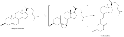 7-Dehydrocholesterol is the precursor of cholecalciferol.[2] Within the epidermal layer of skin, 7-dehydrocholesterol undergoes an electrocyclic reaction as a result of UVB light at wavelengths between 290 and 315 nm, with peak synthesis occurring between 295 and 300 nm.[34] This results in the opening of the vitamin precursor B-ring through a conrotatory pathway making previtamin D3 (pre-cholecalciferol).[35] In a process which is independent of UV light, the pre-cholecalciferol then undergoes a [1,7] antarafacial sigmatropic rearrangement [36] and therein finally isomerizes to form vitamin D3.