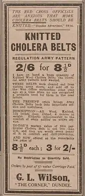 A cholera belt was a flat strip of (usually red) flannel or knitted wool about six feet long and six inches wide which was twisted around the abdomen before wearing a shirt and purported to be a preventive measure against cholera. It was a standard army issue and widely believed to protect the wearer from cholera, dysentery and other ills thought to be brought about by chilling of the abdomen. Their use continued well after the causal agent of cholera was established.[1] In 1848 the instructions to army medical officers in India included the suggestion that every soldier should be provided two "cholera belts". In the early 1900s, its use was still recommended for preventing dysentery.[1] In 1914, donations by the tiny village of Middlemarch, New Zealand of items such as tobacco, shirts and tinned fruit for soldiers going to fight in World War I, included "26 cholera belts".[2] The idea of abdominal chilling as a factor in illness was brought up as late as 1947[3] although it was rejoined by those who pointed out that the idea was not based on experimental evidence.[4]