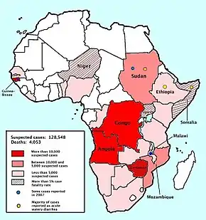 - Somalia, 2017: An ongoing outbreak started in January 2017 in Somalia. By the end of May, there were more than 50,000 cases, associated with 880 deaths; the case fatality rate is 1.7% (2.1% in children). Sixteen of the country's eighteen regions are involved, with the worst affected being Bay and Togdheer.[99]