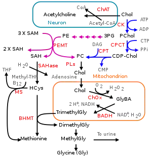 In humans, choline is oxidized irreversibly in liver mitochondria to glycine betaine aldehyde by choline oxidases. This is oxidized by mitochondrial or cytosolic betaine-aldehyde dehydrogenases to trimethylglycine.[6] Trimethylglycine is a necessary osmoregulator. It also works as a substrate for the BHMT-enzyme, which methylates homocysteine to methionine. This is a S-adenosylmethionine (SAM) precursor. SAM is a common reagent in biological methylation reactions. For example, it methylates guanidines of DNA and certain lysines of histones. Thus it is part of gene expression and epigenetic regulation. Choline deficiency thus leads to elevated homocysteine levels and decreased SAM levels in blood.[6]