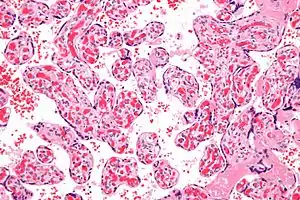 | Micrograph of a chorangiosis. H&E stain. | |