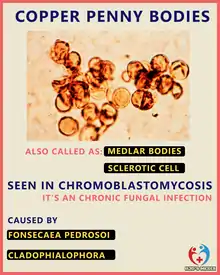 The most informative test is to scrape the lesion and add potassium hydroxide (KOH), then examine under a microscope. (KOH scrapings are commonly used to examine fungal infections.) The pathognomonic finding is observing medlar bodies (also called muriform bodies or sclerotic cells). Scrapings from the lesion can also be cultured to identify the organism involved. Blood tests and imaging studies are not commonly used.On histology, chromoblastomycosis manifests as pigmented yeasts resembling "copper pennies". Special stains, such as periodic acid schiff and Gömöri methenamine silver, can be used to demonstrate the fungal organisms if needed.