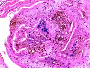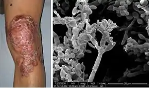 Chromoblastomycosis is a long-term fungal infection of the skin[2] and subcutaneous tissue (a chronic subcutaneous mycosis).[3] The infection occurs most commonly in tropical or subtropical climates, often in rural areas. It can be caused by many different types of fungi which become implanted under the skin, often by thorns or splinters.[4] Chromoblastomycosis spreads very slowly; it is rarely fatal and usually has a good prognosis, but it can be very difficult to cure. The several treatment options include medication and surgery.[5]
