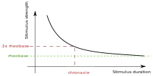 Chronaxie is the minimum time required for an electric current double the strength of the rheobase to stimulate a muscle or a neuron. Rheobase is the lowest intensity with indefinite pulse duration which just stimulated muscles or nerves.[1] Chronaxie is dependent on the density of voltage-gated sodium channels in the cell, which affect that cell’s excitability. Chronaxie varies across different types of tissue: fast-twitch muscles have a lower chronaxie, slow-twitch muscles have a higher one. Chronaxie is the tissue-excitability parameter that permits choice of the optimum stimulus pulse duration for stimulation of any excitable tissue. Chronaxie (c) is the Lapicque descriptor of the stimulus pulse duration for a current of twice rheobasic (b) strength, which is the threshold current for an infinitely long-duration stimulus pulse. Lapicque showed that these two quantities (c,b) define the strength-duration curve for current: I = b(1+c/d), where d is the pulse duration. However, there are two other electrical parameters used to describe a stimulus: energy and charge. The minimum energy occurs with a pulse duration equal to chronaxie. Minimum charge (bc) occurs with an infinitely short-duration pulse. Choice of a pulse duration equal to 10c requires a current of only 10% above rheobase (b). Choice of a pulse duration of 0.1c requires a charge of 10% above the minimum charge (bc).