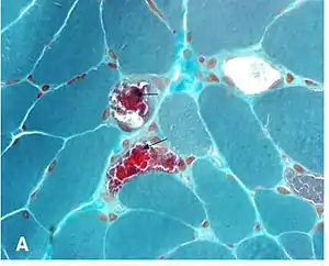 CPEO is diagnosed via muscle biopsy. On examination of muscle fibers stained with Gömöri trichrome stain, one can see an accumulation of enlarged mitochondria. This produces a dark red staining of the muscle fibers given the name “ragged red fibers”. While ragged red fibers are seen in normal aging, amounts in excess of normal aging give a diagnosis of a mitochondrial myopathy.Polymerase chain reaction (PCR), from a sample of blood or muscle tissue can determine a mutation of the mtDNA.