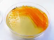 Chryseobacterium is a genus of Gram-negative bacteria. Chryseobacterium species are chemoorganotrophic, rod shape gram-negative bacteria. Chryseobacterium form typical yellow-orange color colonies due to flexirubin-type pigment. The genus contains more than 100 described species from diverse habitats, including freshwater sources, soil, marine fish, and human hosts.[1]