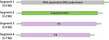 The capsid is about 35-40 nm in diameter. The genome is has four segments (tetrapartit). These segments are separately encapsulated.[4]